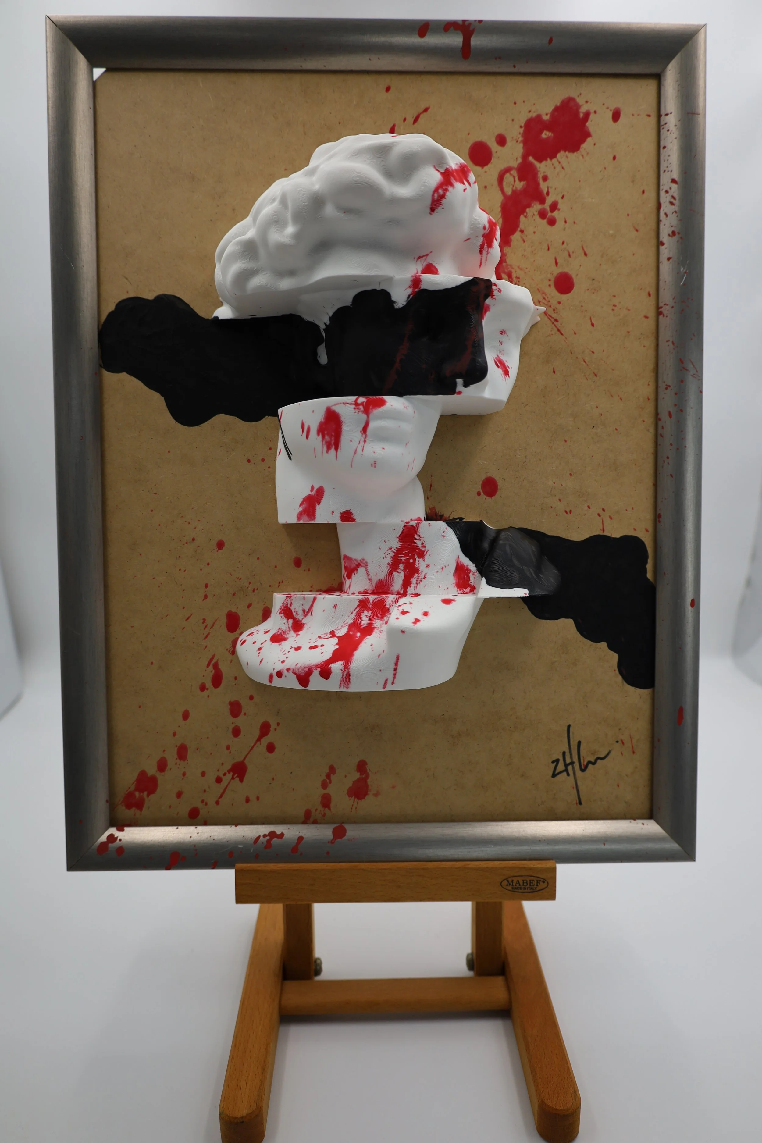 Mixed media artwork featuring a 3D sculpture of a human brain with black and white elements, splattered with red paint resembling blood, mounted on a brown background with a metal frame, signed by the artist.