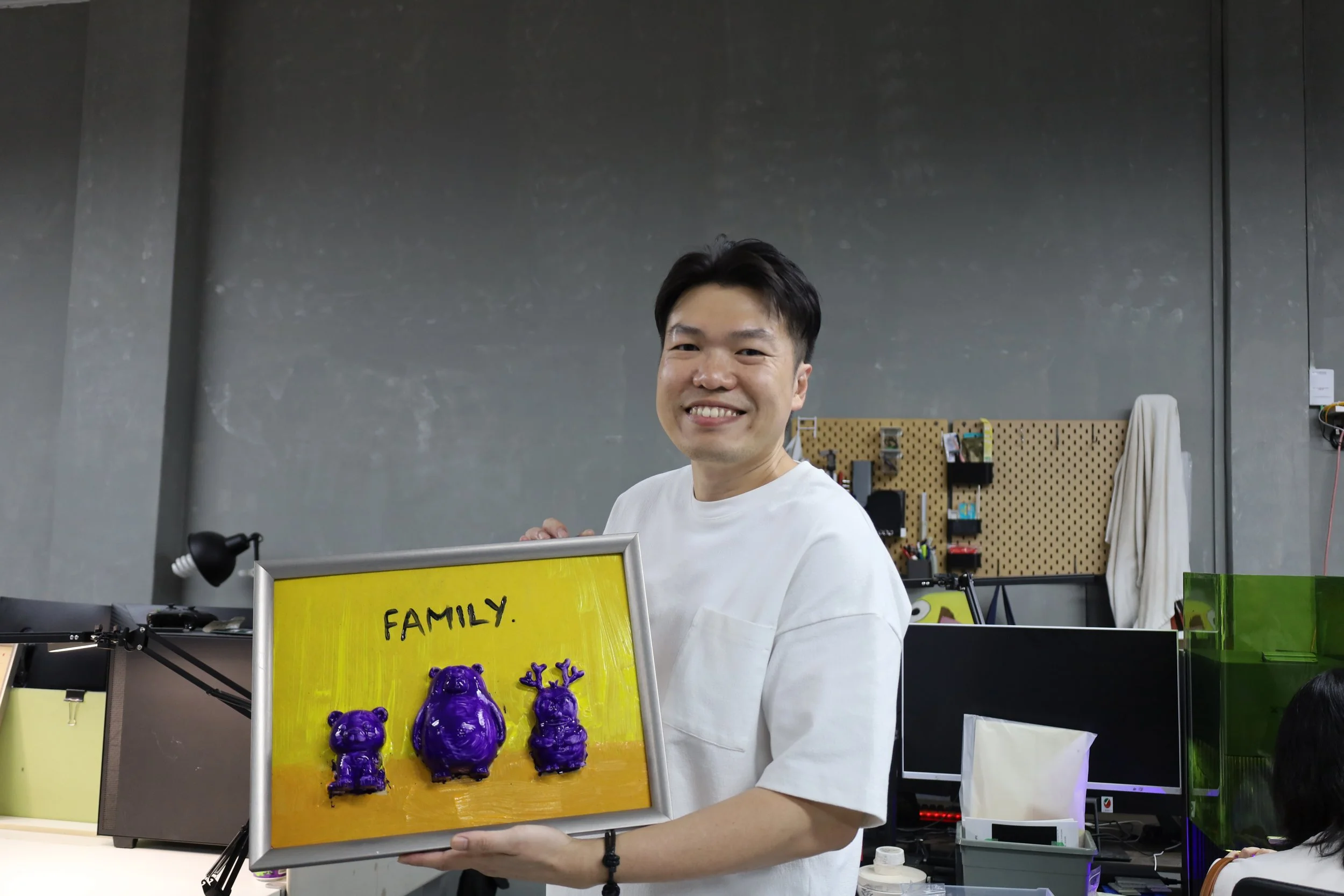 Smiling man holding a yellow framed board with purple bear figurines labeled 'Family' in a modern office or workshop.