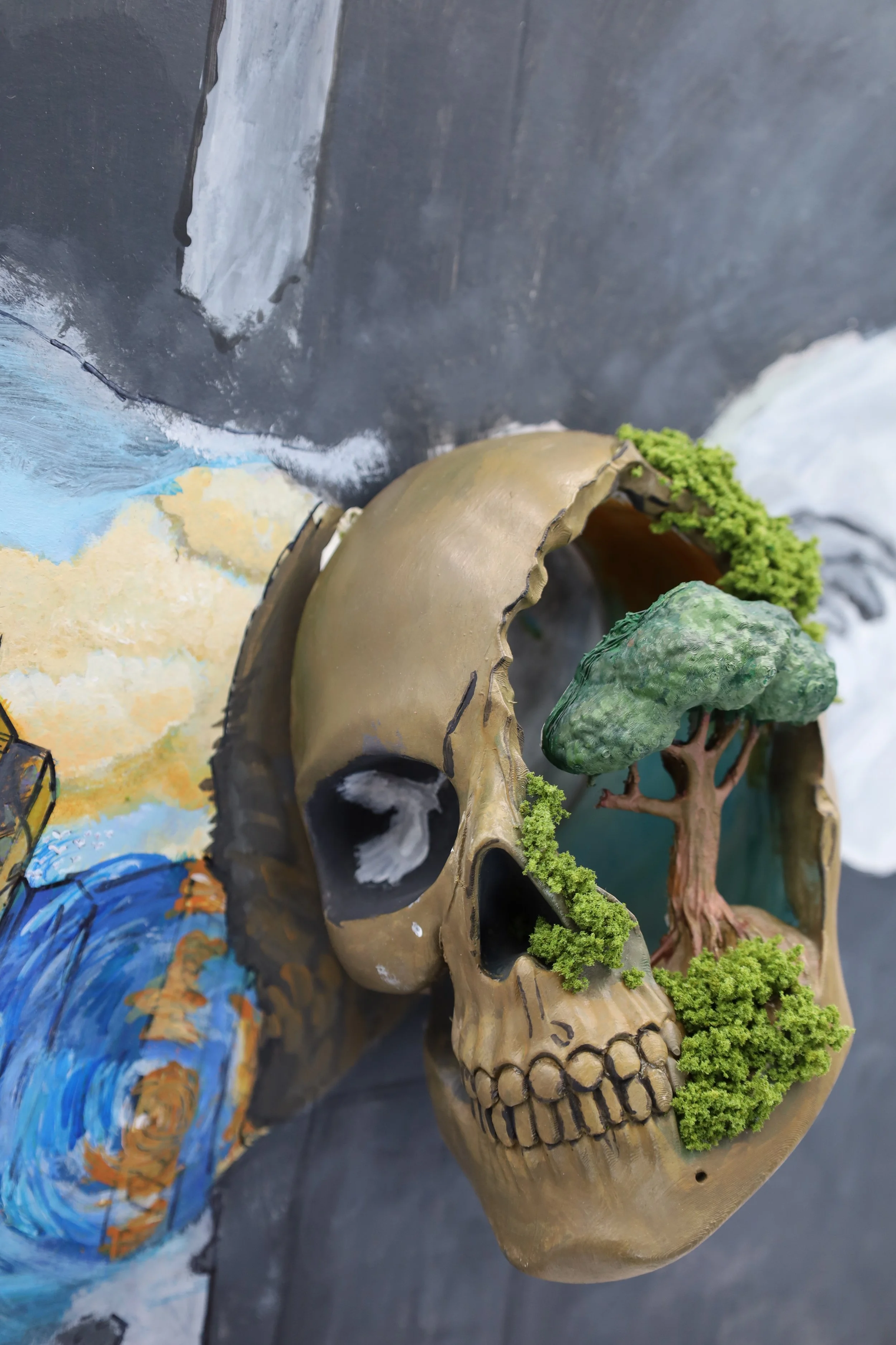Decorative piece featuring a human skull with a miniature tree and greenery inside the hollow eye sockets and on the top, with a painted background showing a landscape with blue water and yellow sky.