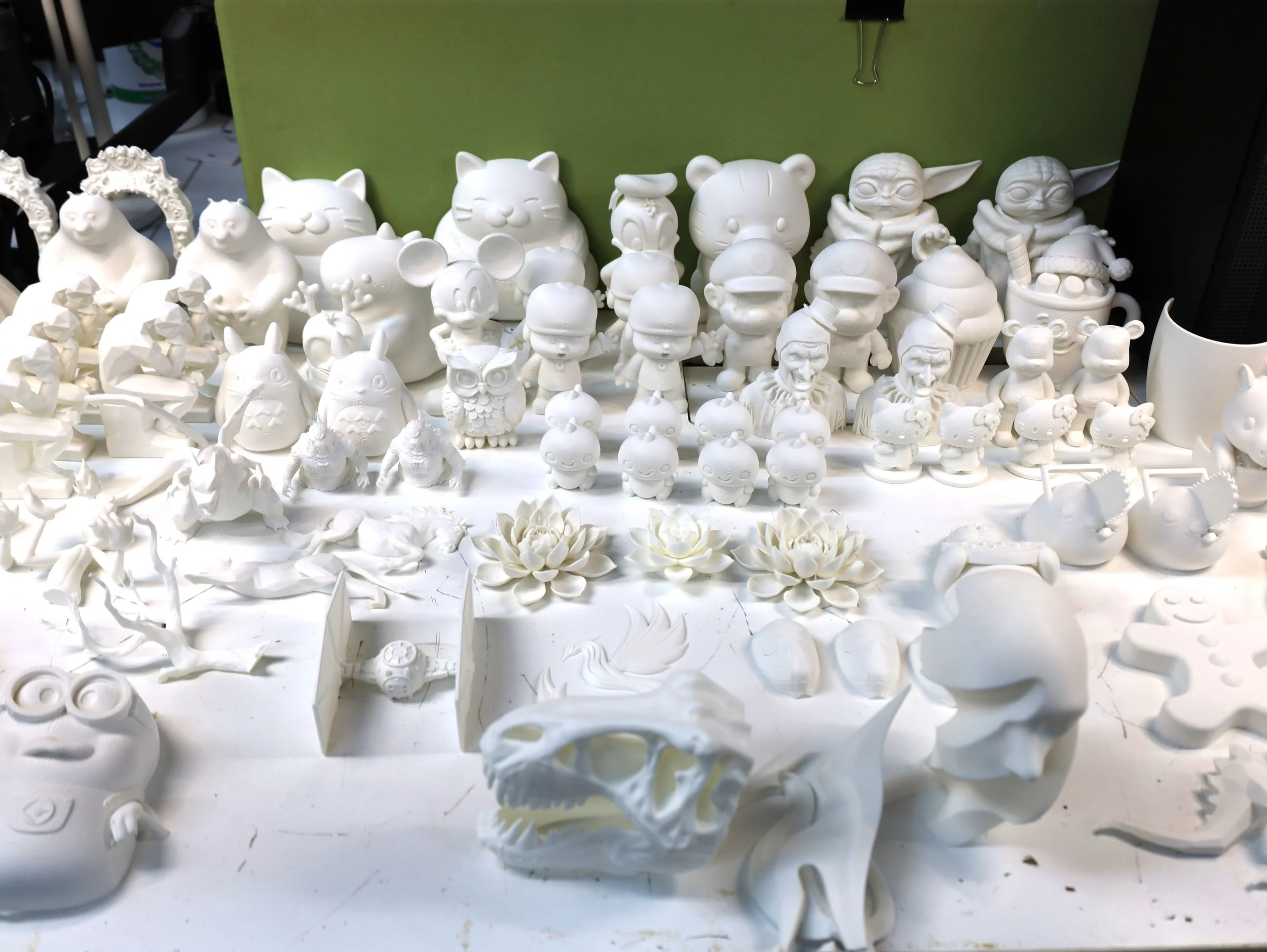 Collection of unpainted ceramic or plaster figurines of various characters including animals, insects, mythical creatures, and cartoon-like figures, displayed on a table.