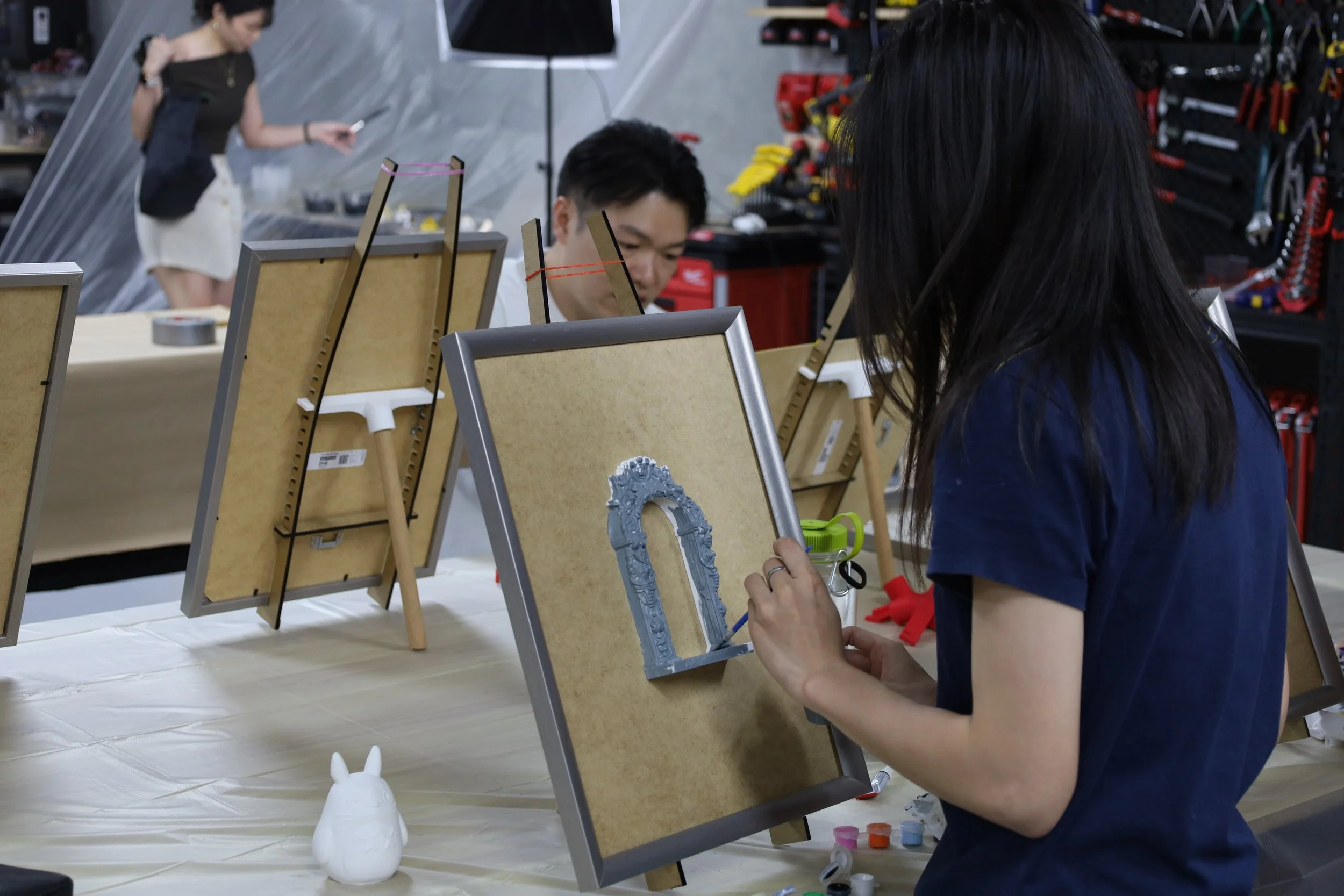 A woman working on a decorative mirror frame at a workshop desk, with three easels and a white ceramic figurine of a cat in the foreground, others in the background, and workshop tools on shelves.