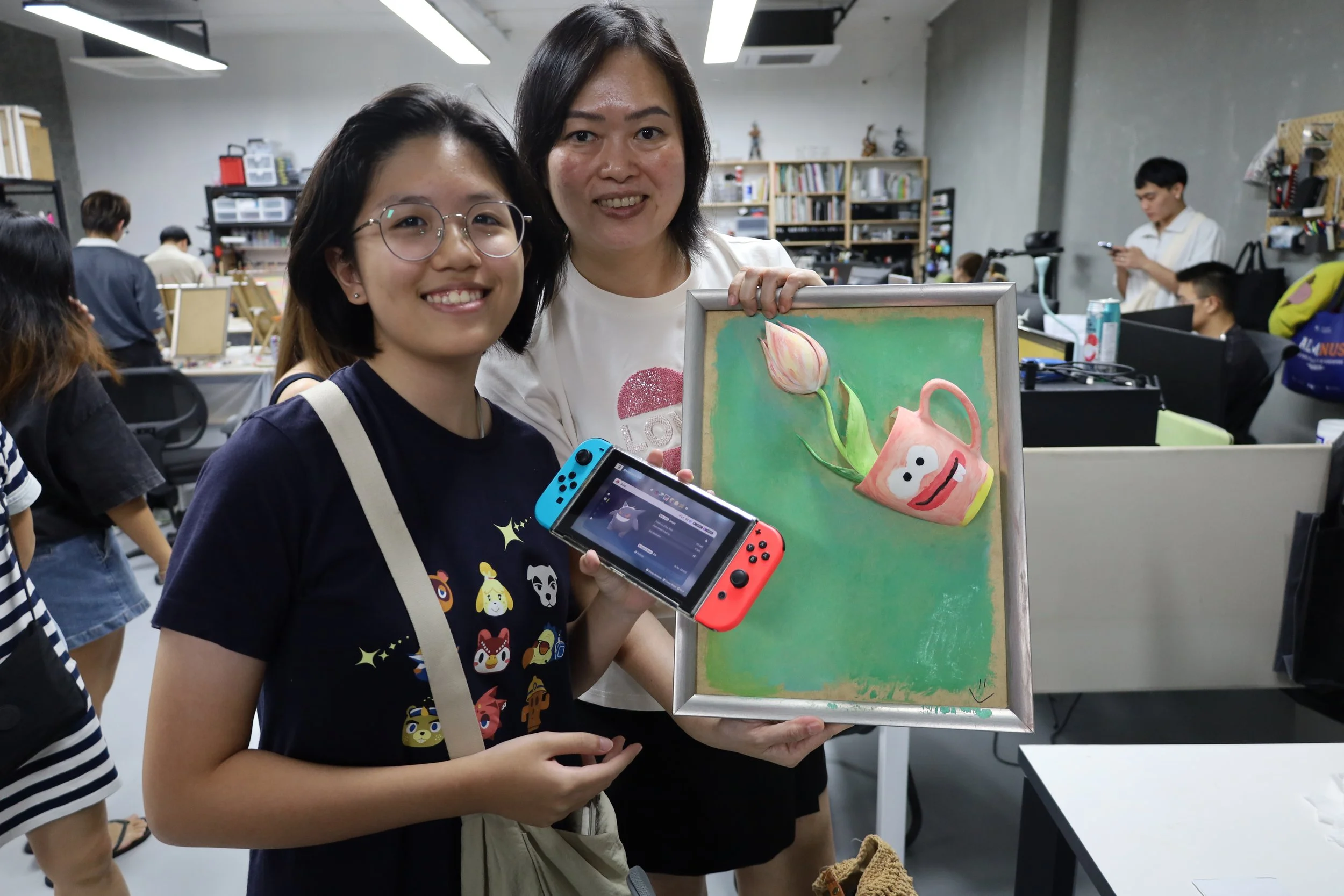 Two women in a showroom or art studio, one holding a framed artwork of a pink teapot with a face and a single flower. The woman in front holds a Nintendo Switch with a screen displaying some content and is smiling at the camera.